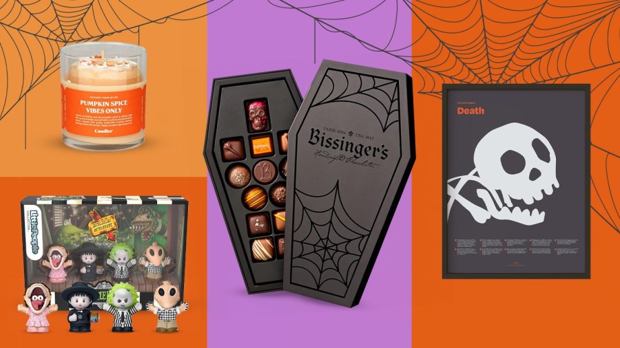 Shop this article: Bissinger’s 12″ Coffin Gift Box, Pumpkin Spice Vibes Only Candle and Fun Facts About Death Print.