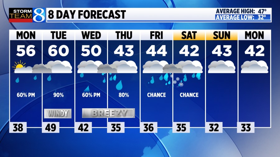 LOOKING AHEAD Rain showers continue into the Thursday and Friday time frame as temperatures cool into the 40s. Cold air on Thursday and again Friday night might be enough for a few sloppy snowflakes mixing in with the rain. Accumulation is not expected at this point. Stay tuned for updates.